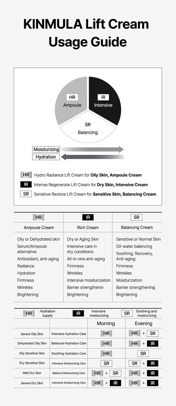 • Even if it is oily skin, if the feeling of dryness is felt after applying the HR Cream, please strengthen the moisturization by adding the SR or IR Cream for both the morning and the evening.